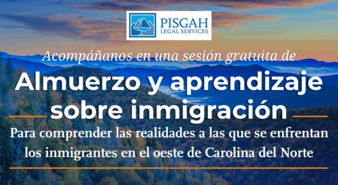 Únase a Pisgah Legal en un almuerzo formativo gratuito centrado en la inmigración. Este evento le permitirá comprender mejor las dificultades a las que se enfrentan los inmigrantes en el oeste de Carolina del Norte y conocer el trabajo que se está realizando para apoyar a las personas y las familias de nuestra comunidad. Los asistentes también descubrirán formas de participar activamente a través de la defensa de los derechos, el voluntariado y la filantropía.