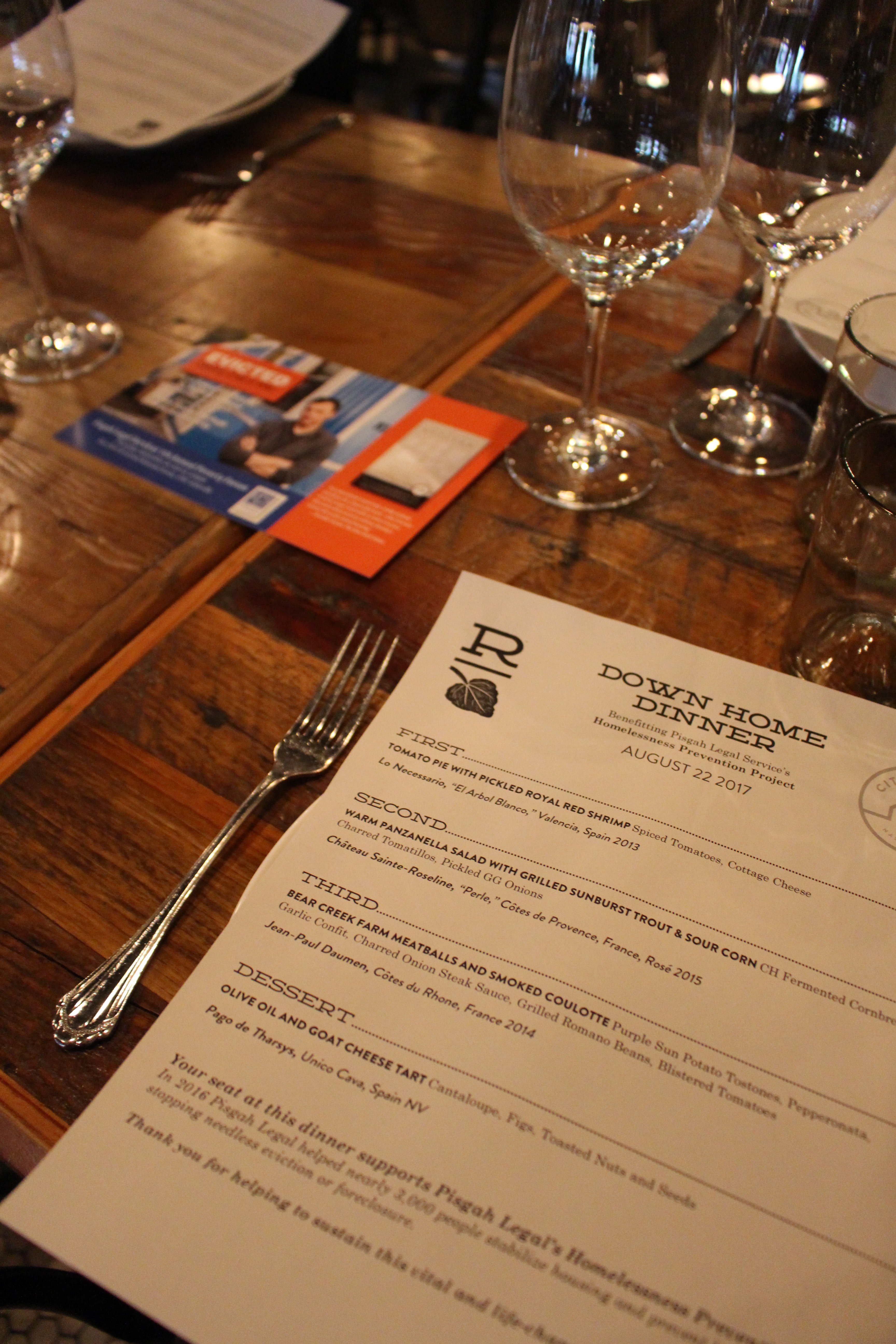 Pisgah Legal Services is so grateful for Rhubarb for hosting this amazing evening, and to Tandy Wilson, Sunburst Trout Farms, Benton’s Smoky Mountain Country Hams, Tryon Wines, Steve Pignatiello, and Bear Creek Farm, and Gaining Ground Farms for contributing time, food, and talent to the delicious meal.