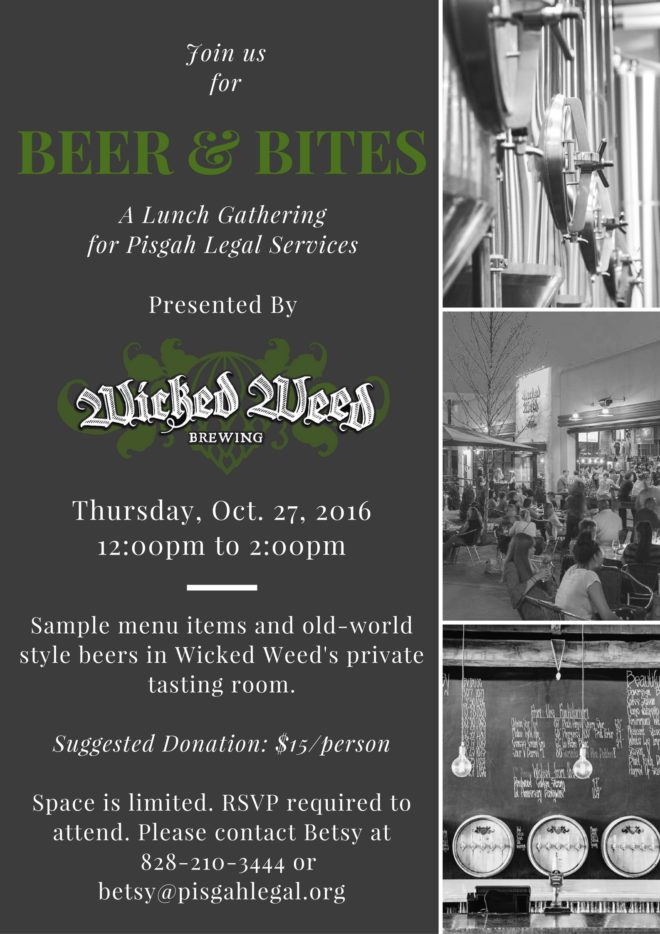 Join Pisgah Legal Services for a fun lunch at Wicked Weed featuring beer and snacks. See the invitation below for details.