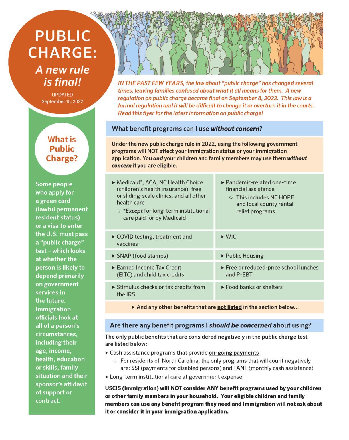 La nueva norma aclara lo que se considera y lo que no se considera en una determinación de carga pública, y proporciona garantías de que las familias inmigrantes elegibles pueden utilizar los programas de atención sanitaria, nutrición y vivienda sin que ello afecte a su situación de inmigración o a sus solicitudes de inmigración.